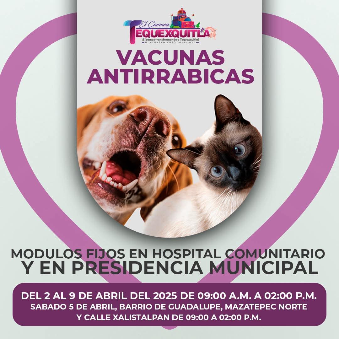 1 DE ABRIL 2025 El Gobierno Municipal de El Carmen Tequexquitla en coordinación con la Regiduría de Salud, invita a la ciudadanía en general a la JORNADA DE VACUNACIÓN ANTIRRÁBICA.🐶😺 Se llevará a cabo el del 2 AL 9 DE ABRIL en un horario de 9:00 a.m. – 2:00 p.m. 😺🐶 Módulos fijos en hospitalSigue leyendo «JORNADA DE VACUNACIÓN ANTIRRÁBICA DEL 2 AL 9 DE ABRIL EN TEQUEXQUITLA»