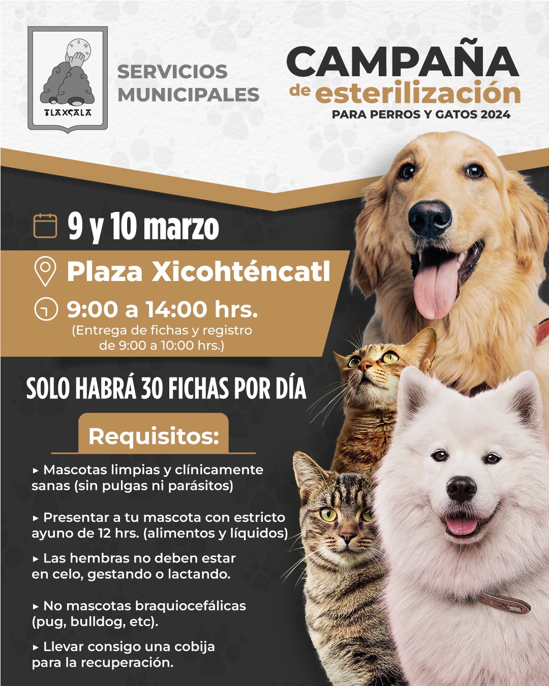 6 DE MARZO 2024 Habrá esterilización de perros y gatos en Tlaxcala Capital El ayuntamiento de Tlaxcala realizará este sábado 9 y domingo 10 de marzo, una jornada de esterilización gratuita de perros y gatos, con el objetivo de contribuir al bienestar animal. Las cirugías se llevarán a cabo en la Plaza XicohténcatlSigue leyendo «HABRÁ ESTERILIZACIÓN DE PERROS Y GATOS EN TLAXCALA CAPITAL»