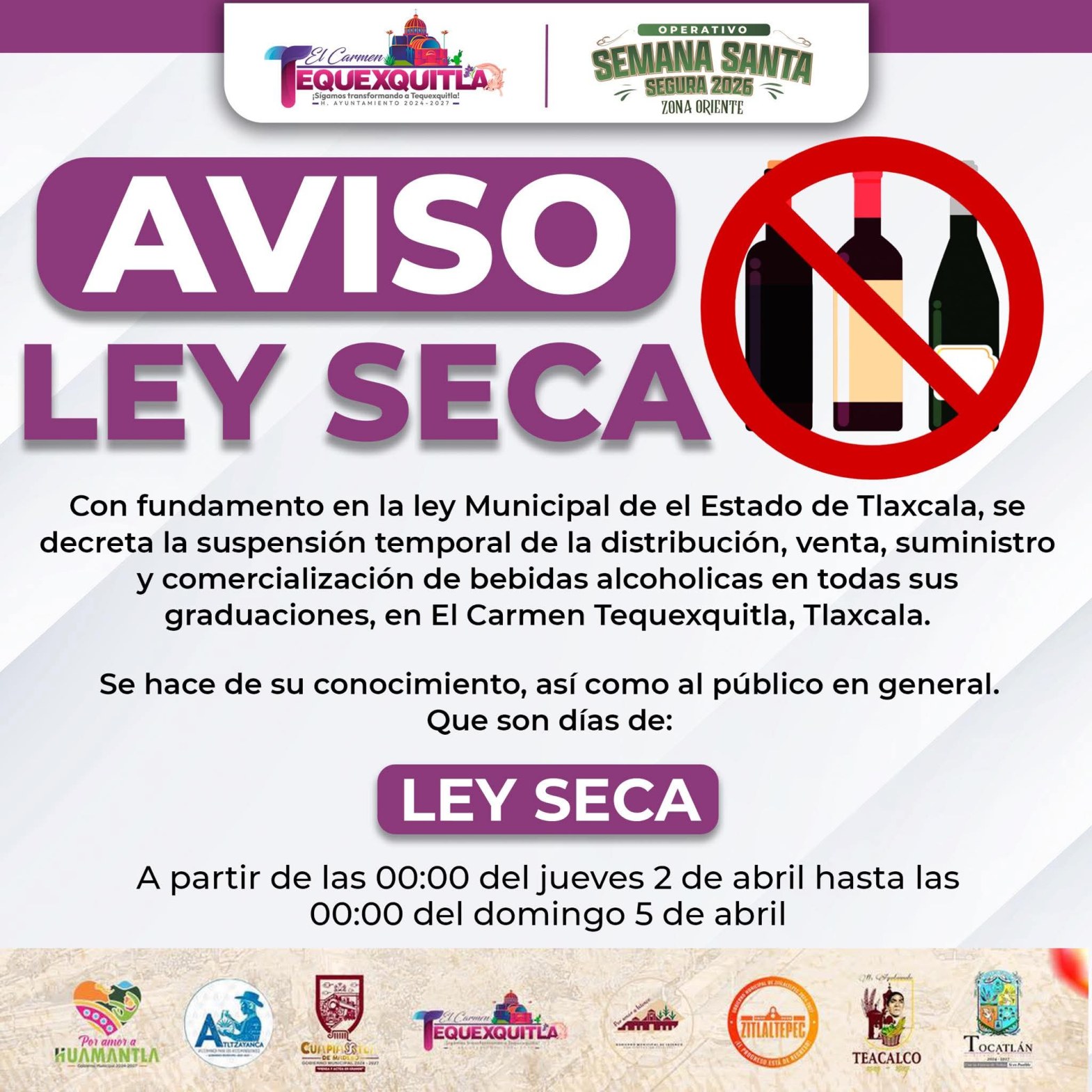 1 DE ABRIL 2026 Como parte del Operativo Semana Santa Segura 2026, Zona Oriente de Tlaxcala, el Gobierno Municipal de El Carmen Tequexquitla informa a la ciudadanía: 🚫🍺 Se implementará la Ley Seca, quedando prohibida la venta, distribución y consumo de bebidas alcohólicas en todo el municipio. 📅 Esta medida estará vigente desde las 00:00Sigue leyendo «🚔🚑COMO PARTE DEL OPERATIVO SEMANA SANTA SEGURA GOBIERNO DE TEQUEXQUITLA INFORMA:»