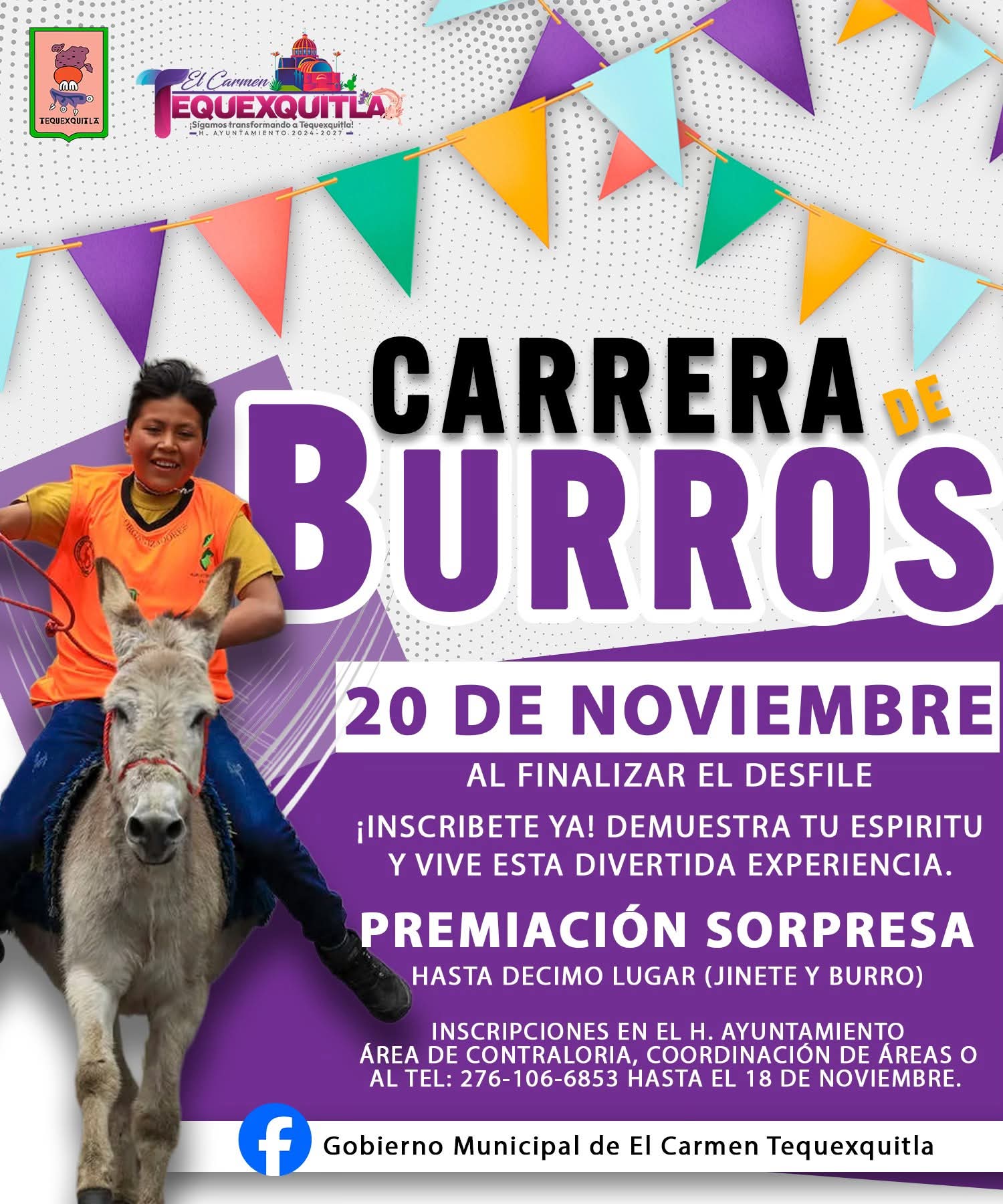 6 DE NOVIEMBRE 2025 🏁🐴 ¡Prepárate para una divertida Carrera de Burros!Este 20 de noviembre, al finalizar el desfile, ven y disfruta de una experiencia muy alegre. 🎉 Habrá premiación sorpresa hasta el décimo lugar, tanto para el jinete como para el burro. 📋 Inscripciones abiertas en:• Área de Contraloría• Coordinación de Áreas• O alSigue leyendo «PREPÁRATE PARA UNA DIVERTIDA CARRERA DE BURROS EN TEQUEXQUITLA»
