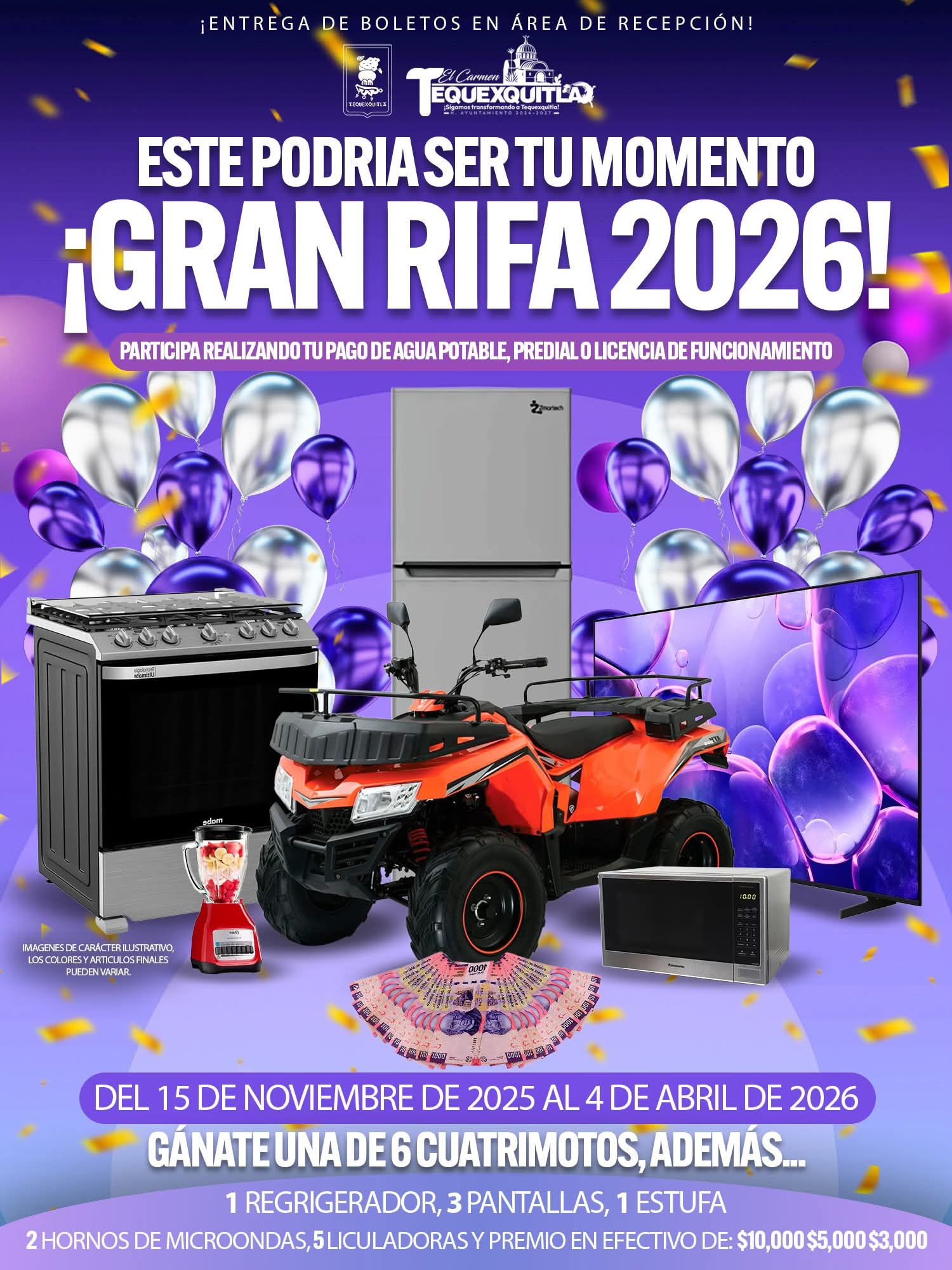 11 DE NOVIEMBRE 2025 🎉 ¡Con mucha emoción llega la Gran Rifa 2026! 🎉 El Gobierno Municipal de El Carmen Tequexquitla te invita a participar y tener la oportunidad de llevarte increíbles premios al realizar tu pago de agua potable, predial o licencia de funcionamiento. 📅 Del 15 de noviembre de 2025 al 4 deSigue leyendo «LLEGA LA GRAN RIFA 2026 A TEQUEXQUITLA»