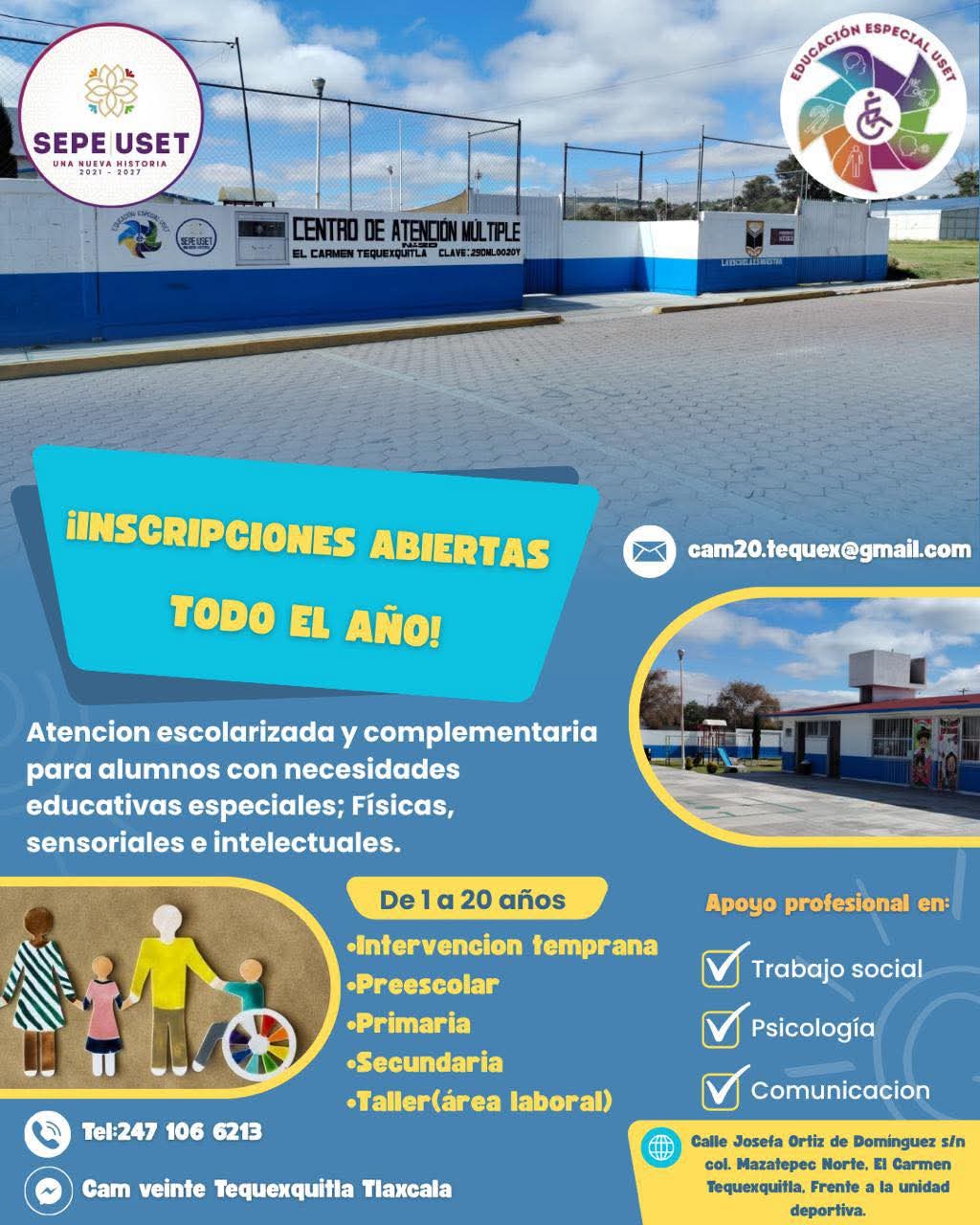 3 DE MARZO 2026 📚✨ El Centro de Atención Múltiple (CAM 20) de El Carmen Tequexquitla mantiene abiertas sus inscripciones para brindar atención escolarizada y complementaria a niñas, niños y jóvenes con necesidades educativas especiales, ya sean físicas, sensoriales o intelectuales. Se ofrece atención desde los 1 hasta los 20 años en las áreas de:🔹Sigue leyendo «CAM TEQUEXQUITLA MANTIENE ABIERTAS SUS INSCRIPCIONES»