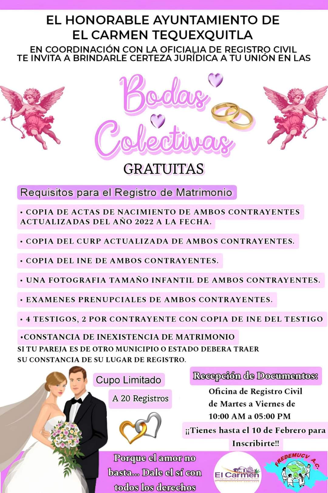 8 DE FEBRERO 2024 👰🏻♀️ a través del Registro Civil municipal invitan a todas las parejas que quieran contraer matrimonio a registrarse en el programa vigente bodas colectivas. 👀Checa los requisitos en la publicidad y recuerda que todos los documentos son OBLIGATORIOS para ambos contrayentes.📌 Acude a la oficina a partir de estos momentos ySigue leyendo «🤵🏻♂️💍‼️BODAS COLECTIVAS 2024 EN TEQUEXQUITLA‼️💍👰🏻♀️🤵🏻♂️»