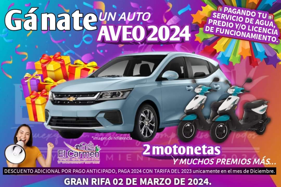 16 DE DICIEMBRE 2023 El Gobierno Municipal de El Carmen Tequexquitla te invita a participar en la GRAN RIFA 2024 dónde además podrás llevarte una de las dos motonetas Italika modelo D125 que tenemos para tí, pagando tus servicios de agua potable, predial y si tienes un negocio tu Licencia de funcionamiento. #TequexquitlaOrgulloyCompromisodeTodos ✅ ObténSigue leyendo «🚘🤩𝐆𝐀𝐍𝐀𝐓𝐄 𝐔𝐍 𝐀𝐔𝐓𝐎𝐌Ó𝐕𝐈𝐋 𝐂𝐇𝐄𝐕𝐑𝐎𝐋𝐄𝐓 𝐀𝐕𝐄𝐎 𝐌𝐎𝐃𝐄𝐋𝐎 𝟐𝟎𝟐𝟒. 💥»