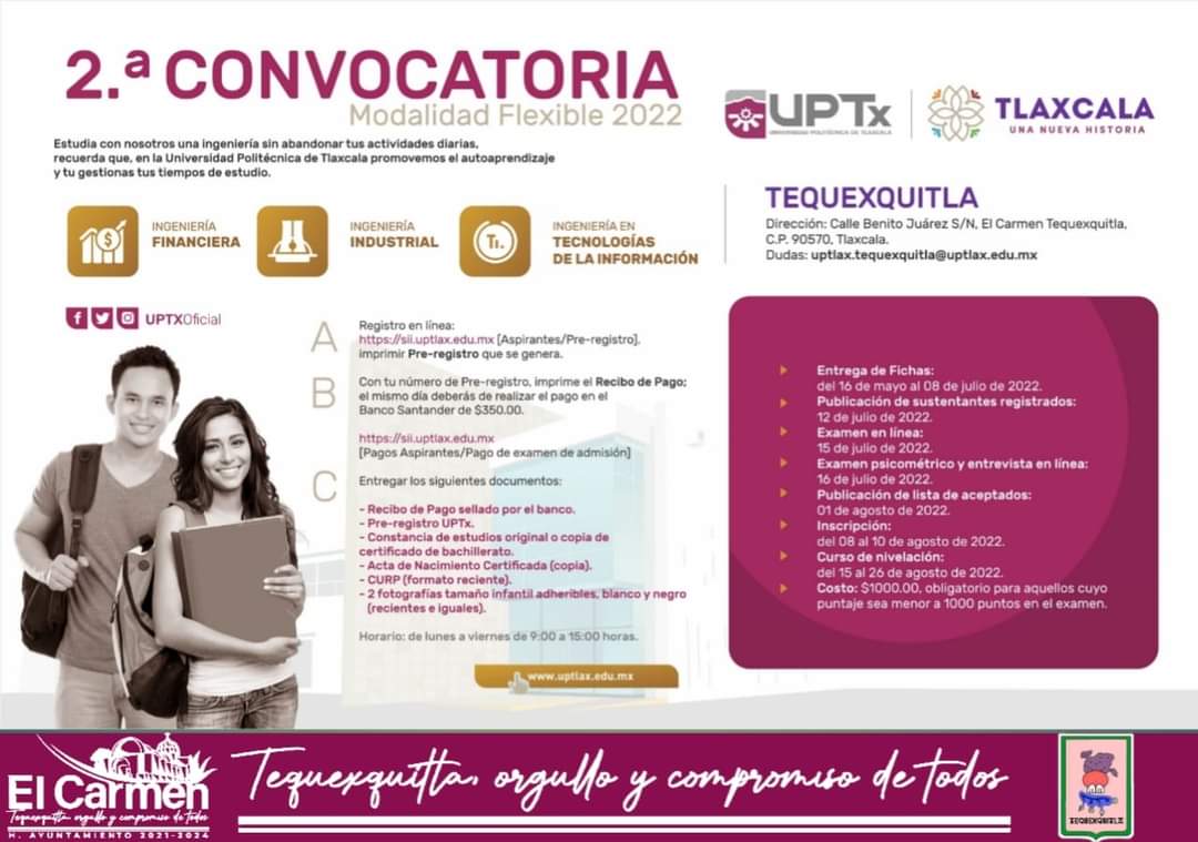17 DE MAYO 2022 ¡No te quedes sin estudiar!✍️🧑🎓La universidad Politécnica de Tlaxcala campus Tequexquitla, los invita a inscribirse a su segunda convocatoria 2022, en las carreras de: 🔸 Ingenieria Industrial 🦺🥾🪖🔸Ingeniería Financiera 🏢💵💰🧮🔸Ingeniería en Tecnologías de la información 📱🧑💻💻 Entrega de fichas del 16 de mayo al 08 de julio de 2022, en lasSigue leyendo «SE PARTE DE LA UPT TEQUEXQUITLA»