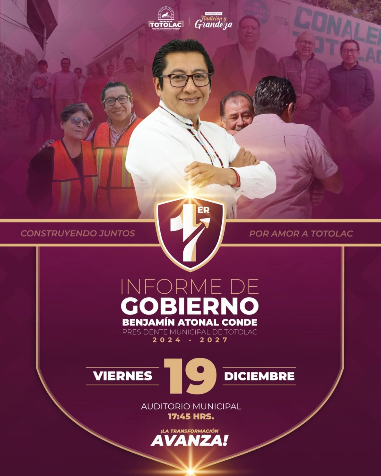 15 DE DICIEMBRE 2025 ¡La Transformación Avanza en Totolac! 💯 Tras un año de gestión y resultados, el Gobierno Municipal de Totolac 24-27 que encabeza el presidente municipal Benjamín Atonal Conde realizará su Primer Informe de Gobierno. En esta rendición de cuentas detallaremos los logros alcanzados, las gestiones realizadas y los objetivos por cumplir deSigue leyendo «LA TRANSFORMACIÓN AVANZA EN TOTOLAC»