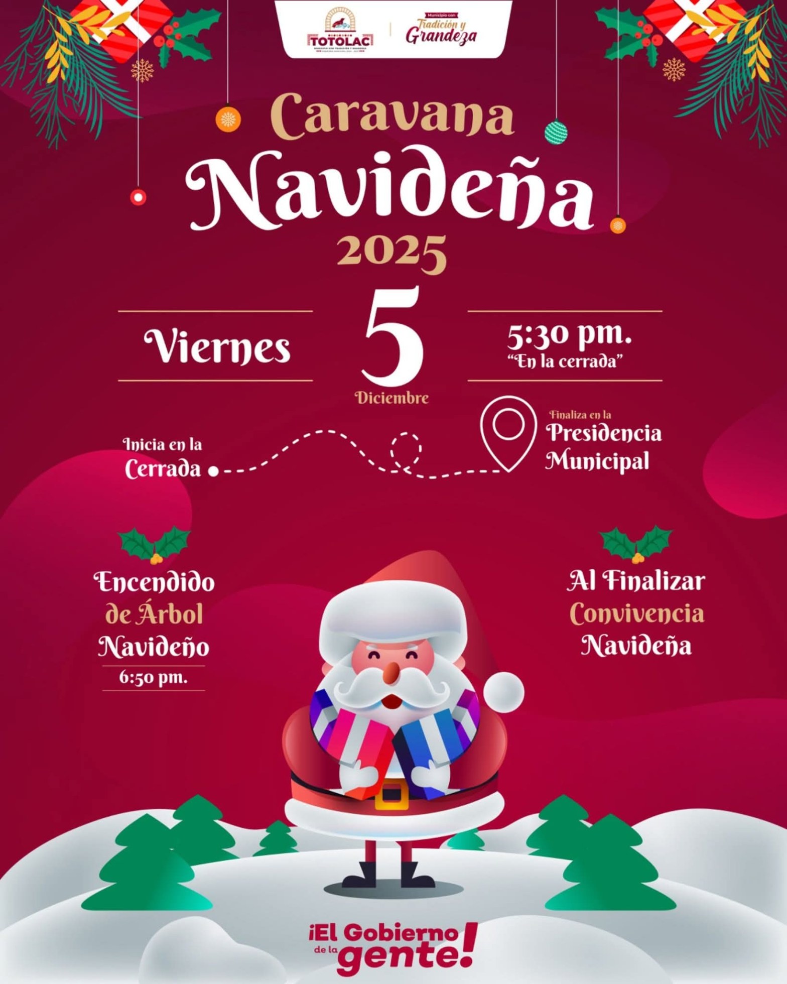 5 DE DICIEMBRE 2025 ¡Es hoy, es hoy! 🎅🏼🦌🎄 Únete a la Caravana Navideña que llenará de luz y alegría nuestras principales calles del municipio. Al finalizar, juntos haremos el Encendido Oficial de nuestro Árbol Navideño y cerraremos con una cálida Convivencia para celebrar en familia. ¡Te esperamos para vivir la magia de la Navidad!Sigue leyendo «HOY GRAN CARAVANA NAVIDEÑA EN TOTOLAC»