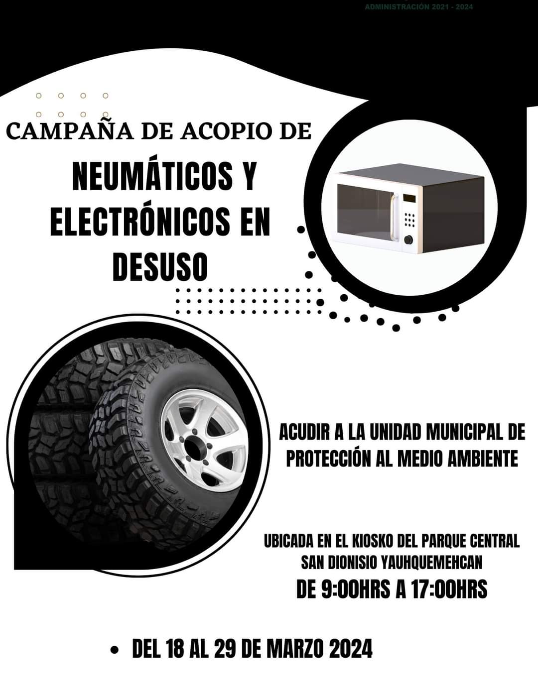 13 DE MARZO 2024 La Unidad Municipal de Protección al Medio Ambiente, Invita a toda la ciudadanía de Yauhquemehcan, a participar en la campaña de «Acopio de Neumáticos y Electrónicos en desuso», del 18 al 29 de marzo 2024. «Logremos un mundo mejor.»