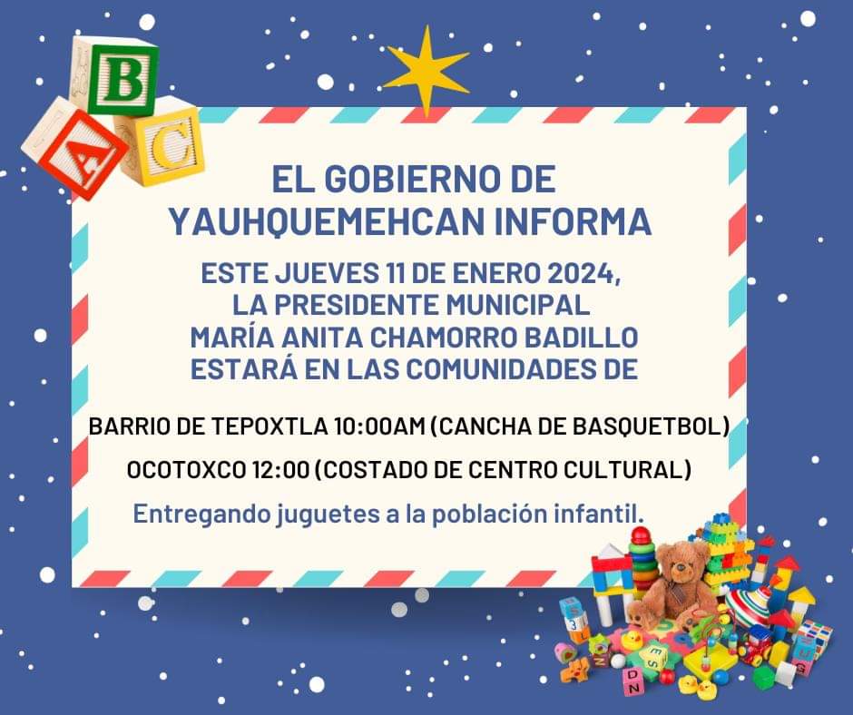 10 DE ENERO 2024 Atención Niños del Barrio de Tepoxtla y Ocotoxco Estaremos con ustedes, entregando juguetes por parte de la presidente municipal María Anita Chamorro Badillo.¡Allá nos vemos! Gobierno de Yauhquemehcan 2021-2024 BienestarQueFluye
