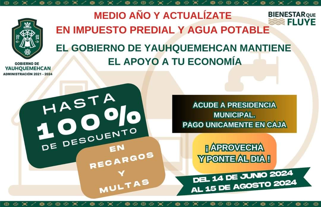 25 DE JUNIO 2024 📣 Apoyo de mitad de año‼️Ponte al corriente con tu Predial 🏠, y Agua Potable. Aprovecha los descuentos y facilidades que el Gobierno de Yauhquemehcan 2021-2024 anuncia en beneficio de la economía de las familias del municipio.📆 Del el 14 de junio al 15 de agosto 2024. BienestarQueFluye