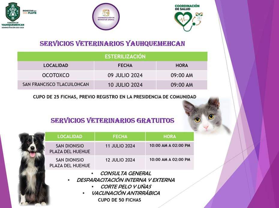 2 DE JULIO 2024 La Coordinación de Salud del Gobierno de Yauhquemehcan 2021-2024 realizará la tercera jornada del 2024 de «CIRUGÍAS DE ESTERILIZACIÓN» de perros y gatos, con el Centro Veterinario Antirrábico. Consulta tu comunidad y fecha. BienestarQueFluye