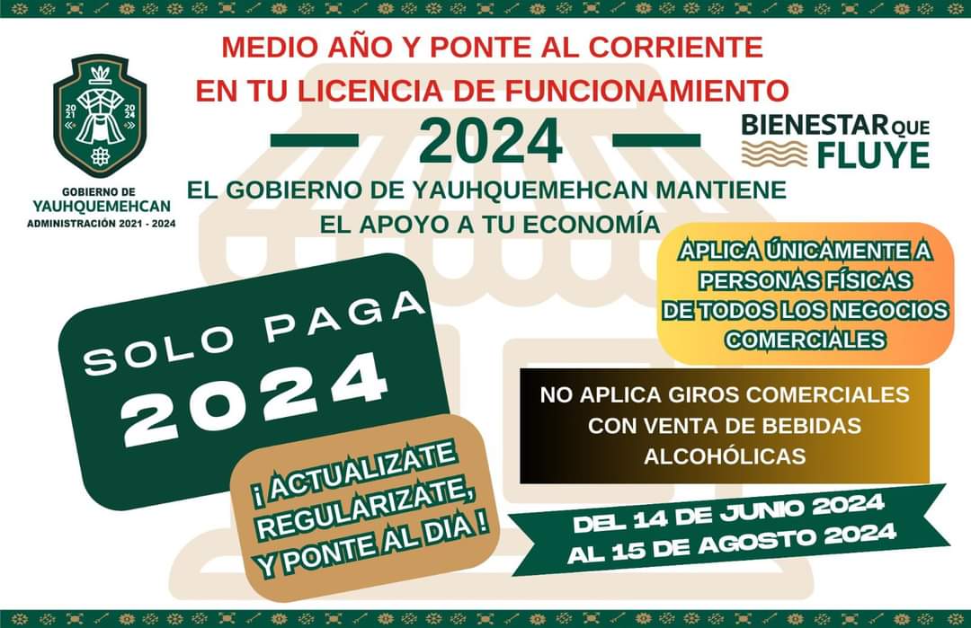3 DE JULIO 2024 📣 Apoyo de mitad de año‼️Ponte al corriente con tu Licencia de Funcionamiento. Aprovecha los descuentos y facilidades que el Gobierno de Yauhquemehcan 2021-2024 anuncia en beneficio de la economía de las familias del municipio.📆 Del el 14 de junio al 15 de agosto 2024. BienestarQueFluye